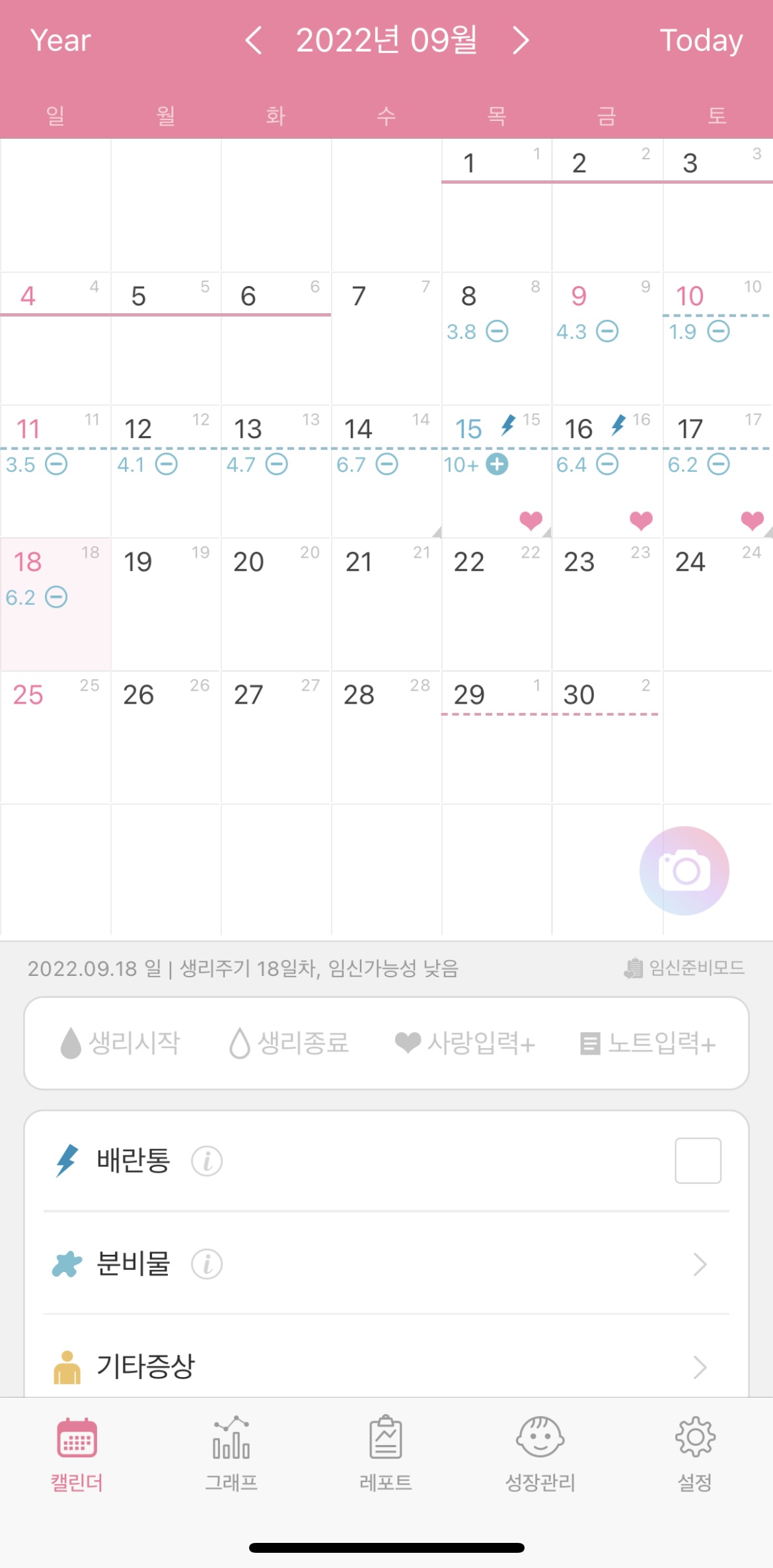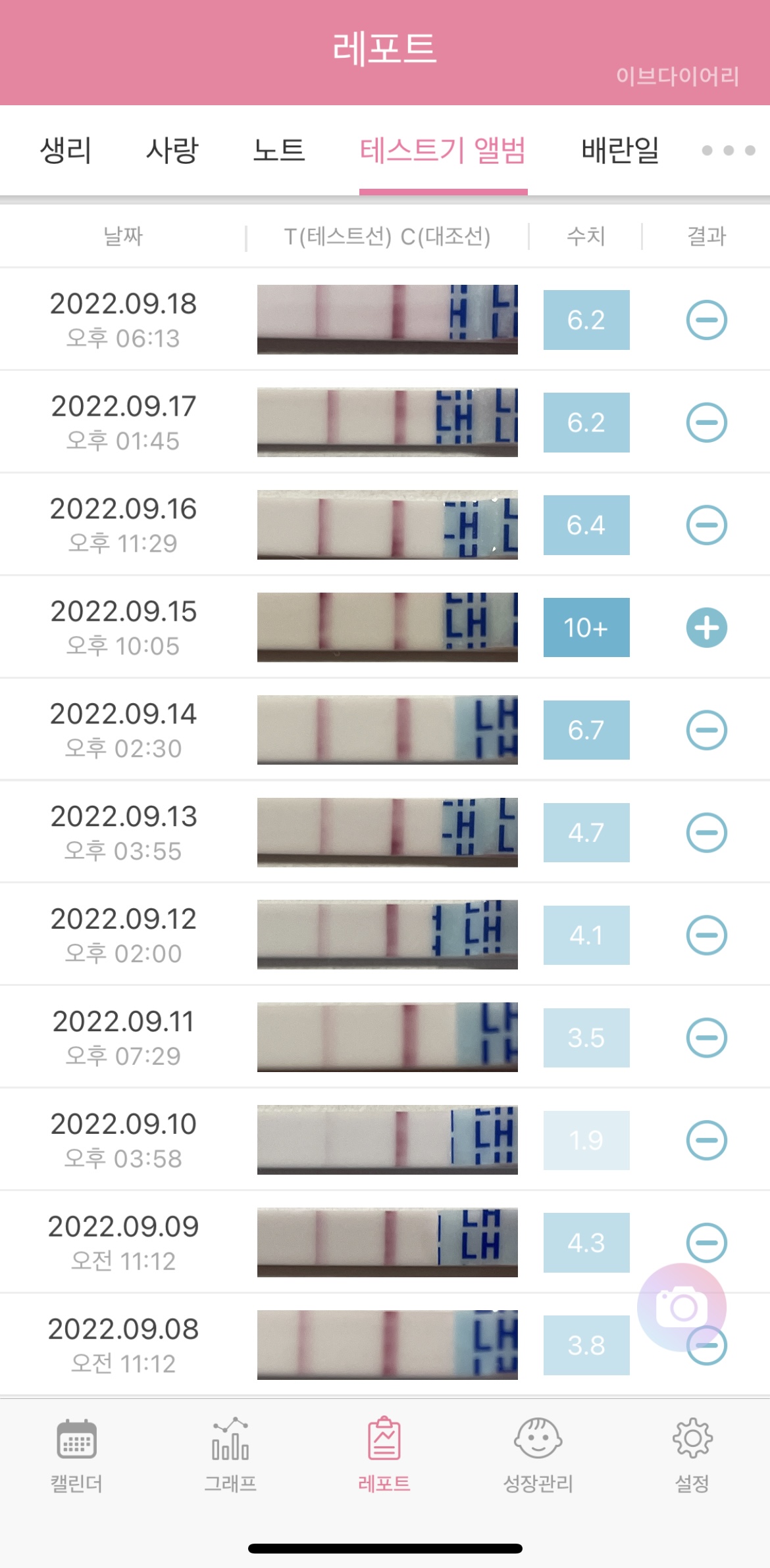 2) 하단 중앙에 위치한 '레포트' 탭을 누르고, 상단에 '테스트기 앨범'을 눌러 들어가면, 우측 하단에 촬영할 수 있는 카메라 버튼이 있습니다.