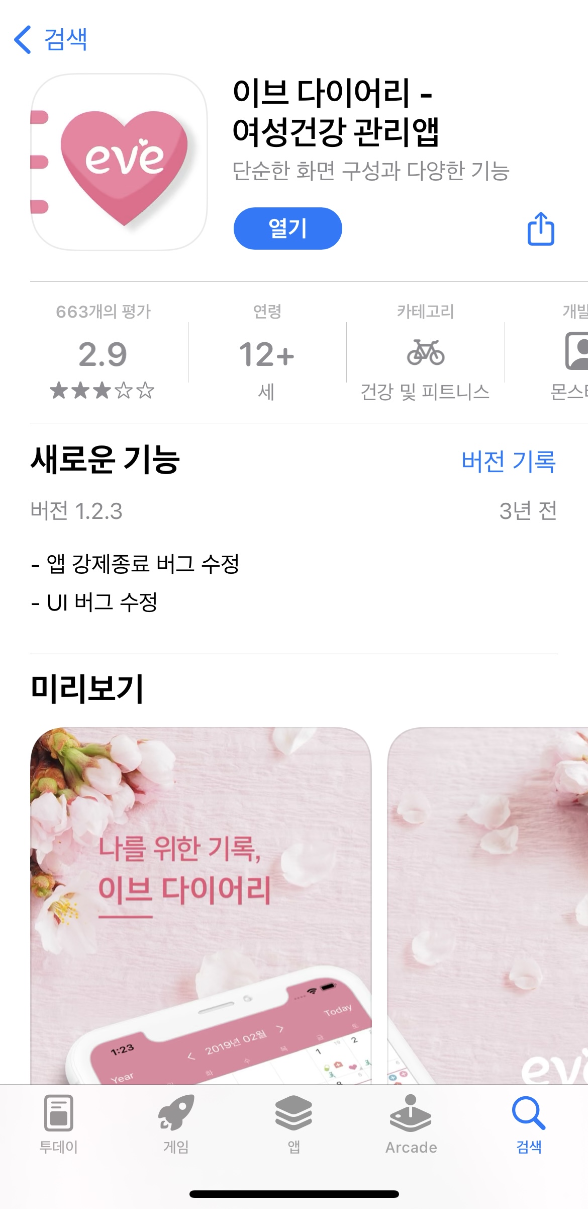 1) Play스토어나 AppStore에 '이브다이어리' 앱을 검색하여 설치합니다.